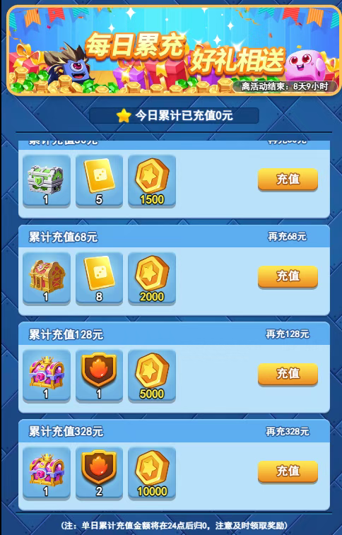 活动期间每日累计充值一定金额,即可领取额外奖励,活动将在每日的24点重置,未领取的奖励将会消失。