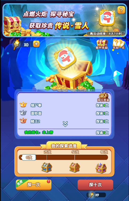 活动期间消耗火炬进行探宝,每次探宝将获取随机奖励,达到一定次数后即可抽取进度奖励,抽取达到一定次数可额外领取次数奖励。(火炬可在火炬商店购买折扣火炬礼包或使用钻石抵扣)